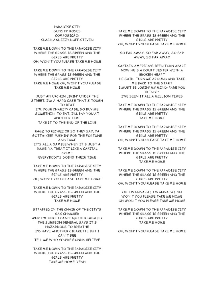 Guns N Roses - Paradise City Lyrics LRC 002200Take me down to the paradise city 002440Where the grass is green and the girls are pretty 002710Take me home oh wont you please take me home 003220Take me down to the paradise city 003460Where the grass is green and the girls are pretty. You gotta keep pushing for the fortune and fame. In the song Paradise City by Guns N Roses is the Paradise City referenced by the song and its title based on an actual city similar to how The Jungle in Welcome to the Jungle refers to LA. Joao Dapaixao from Paradise City from Burnout Paradise Here in actual Paradise City we say.